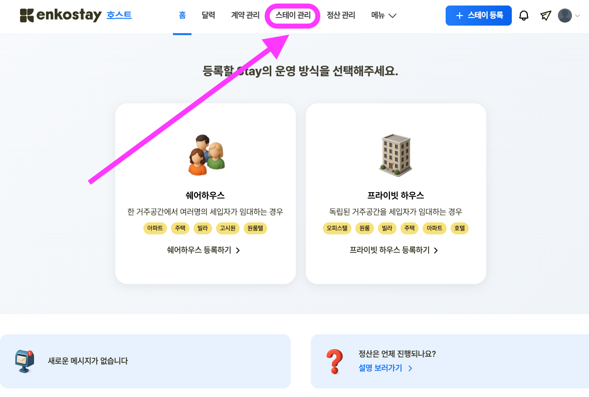등록한 스테이의 주거 타입은 어디에서 확인할 수 있나요? 2025년 09월 25일 09:40 업데이트 시간 호스트센터에 접속하셔서 “스테이 관리” 로 이동해주세요. 스테이를 선택하시면 하우스 타입을 포함한 세부 정보를 확인 및 수정하실 수 있습니다. 관련 문서 등록한 스테이의 베딩 유무상 제공 여부는 어디에서 확인할 수 있나요? 호스트 약관 및 규정 엔코스테이는 어떤 서비스인가요? 호스트 가입 조건이 있나요? 스테이는 어떻게 등록할 수 있나요?