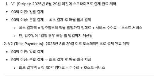 90박 이상 계약의 경우, 분할 결제가 이루어집니다. 자세한 내용은 하기 이미지와 호스트 약관/규정에서도 확인하실 수 있습니다.