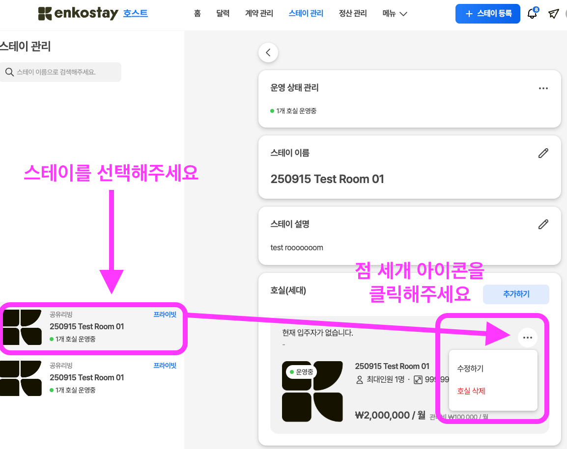 베딩(침구류) 비용을 변경하고 싶어요. 2025년 09월 25일 09:58 업데이트 시간 호스트센터에 접속하셔서 “스테이 관리” 로 이동해주세요. 스테이를 선택하신 후 [방] 부분에 점 세개 아이콘을 클릭하시면 “수정하기” 버튼을 누를 수 있습니다. “수정하기” 페이지에서 베딩(침구류) 비용을 포함하여, 임대료, 관리비, 퇴거 청소비까지 모두 수정하실 수 있습니다. 관련 문서 기간별 할인 설정 가능한가요? 비수기와 성수기 가격을 다르게 하고 싶어요. 관리비는 어디에서 설정 및 변경하나요? 호스트 약관 및 규정 정산은 언제 진행되나요? 매물 가격은 어떻게 설정하면 될까요? 엔코스테이 기준이 있나요?