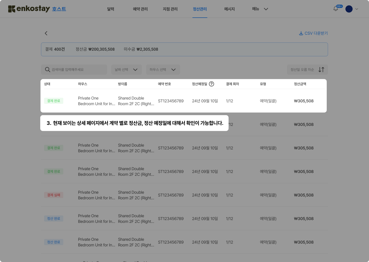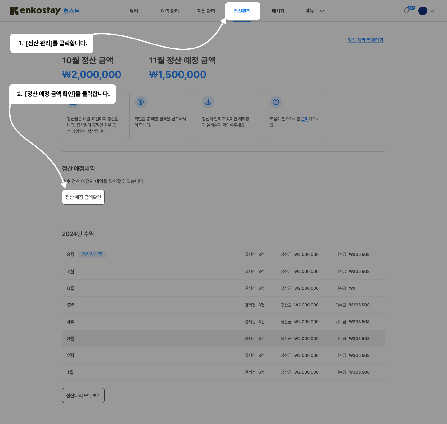 따라서, 개별 계약마다 정산 일정이 다를 수 있어 정확한 일정은 호스트 관리 페이지에서 확인해주셔야 합니다.