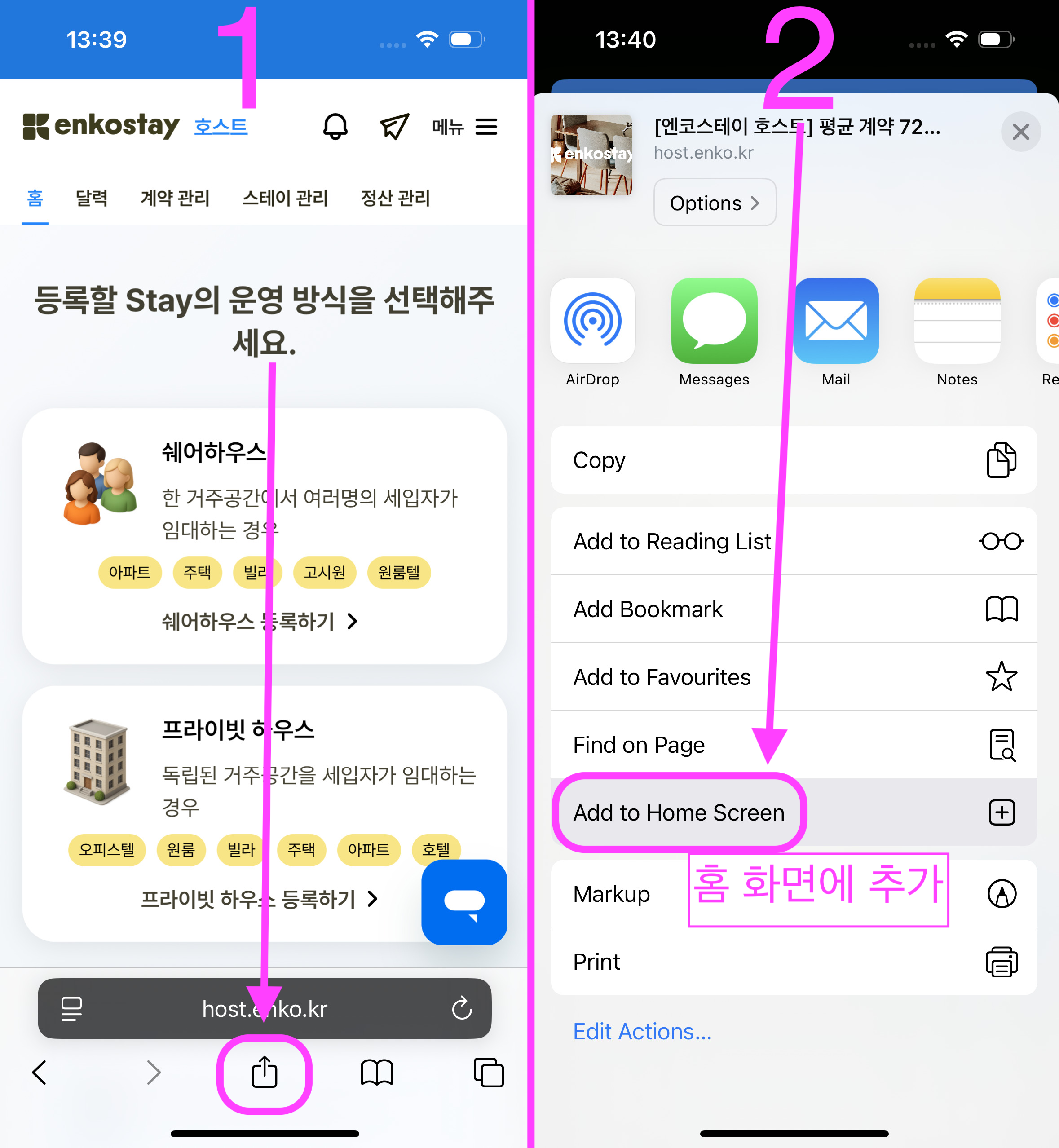 - 모바일 브라우저 Safari(사파리)를 통해 엔코스테이 호스트센터로 이동해 주세요.