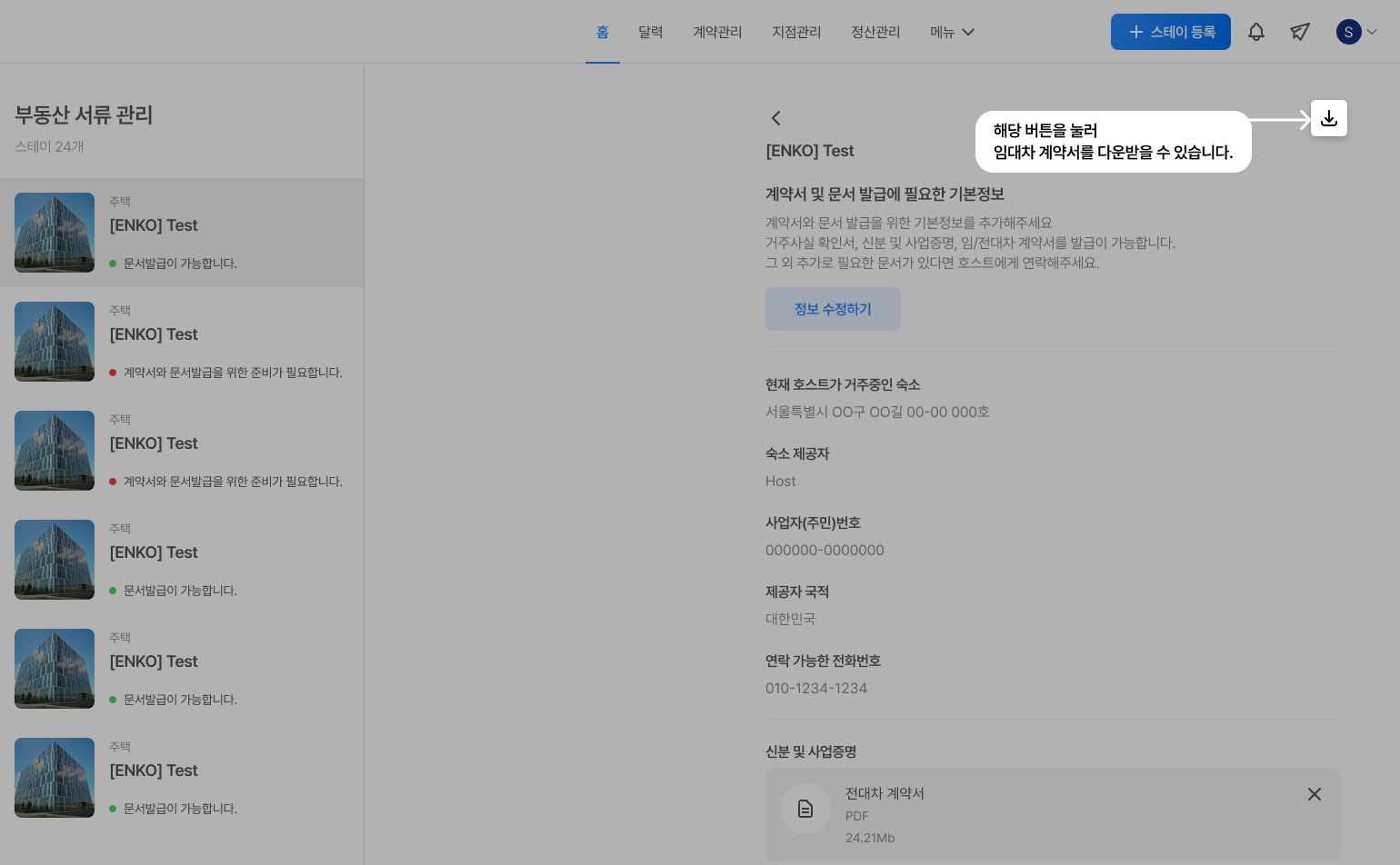 세입자는 세입자 페이지 (https://stay.enko.kr)에서 문서를 직접 다운로드할 수 있습니다.